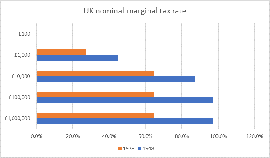 But while the human catastrophe was tragic and imperial disaster a mess needing to be fixed (they weren’t), the worst long-term consequences of the Second World War were financial. The tax rates on large incomes (often made large by out-of-control inflation), rose to nearly 100%, and made it impossible for the established powers to live lives of the sort that once defined British country life, thus causing cascading consequences for those dependent on them. Whereas the old system had drawn wealth and investment into the countryside, supporting farms and building modernized housing, that died. The old families lost most everything—with the government even wrecking the houses it took over during the war and refusing to fix them after—and so had to work instead of managing the great estates, drawing yet more wealth into London and out of everywhere else.