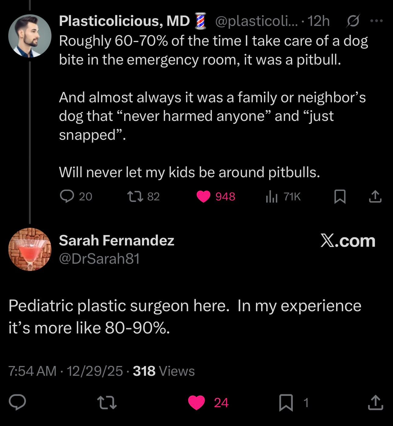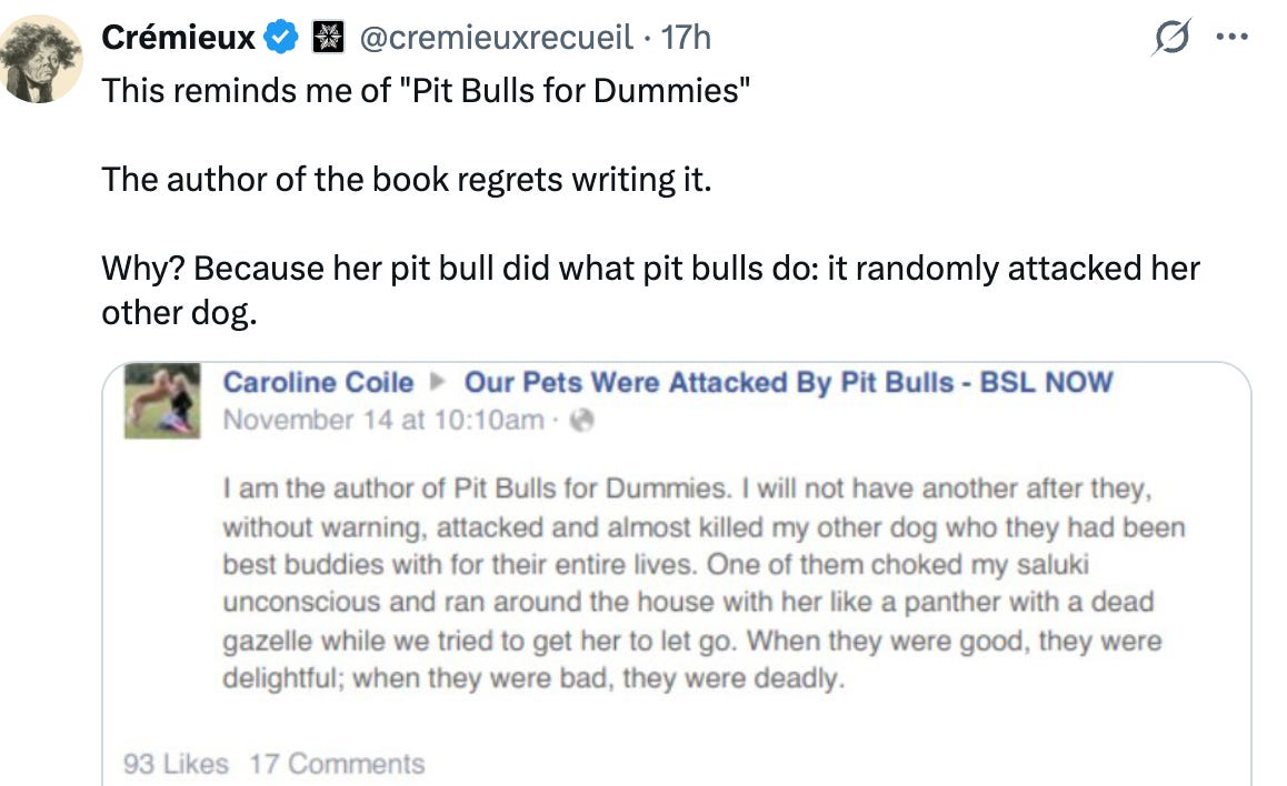 It is a dog with no redeeming characteristics. However many pictures of pitbulls with (photoshopped) flower halos are posted to Facebook, the truth is that they are extremely and irrationally violent by their very nature. As Alexander Cortes put it on X, “Pitbulls were bred to be satanic killdozers for dog fighting, the puppies will cannibalize each other. They are a selective breeding mistake.”1