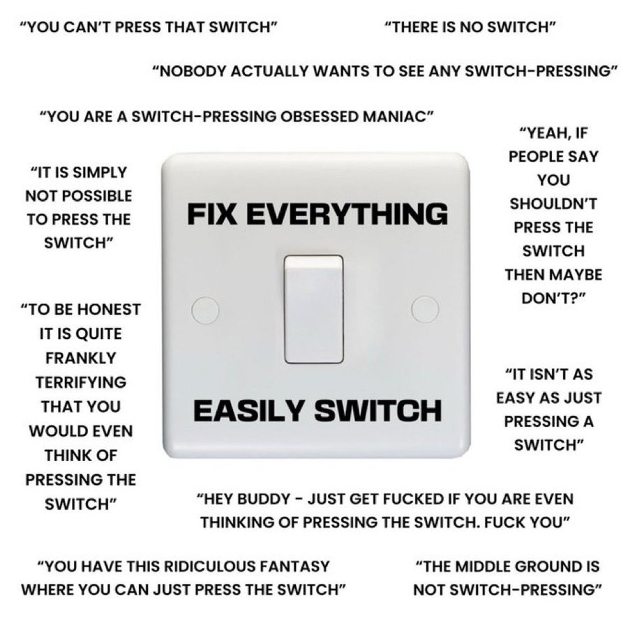 It’s a classic case of the “Fix Everything Easily Switch”. We could just press the button, solve the problem, and move on without the cost formerly imposed by the problem continuing to afflict us; doing so would bring only benefits.