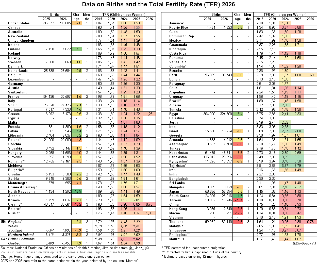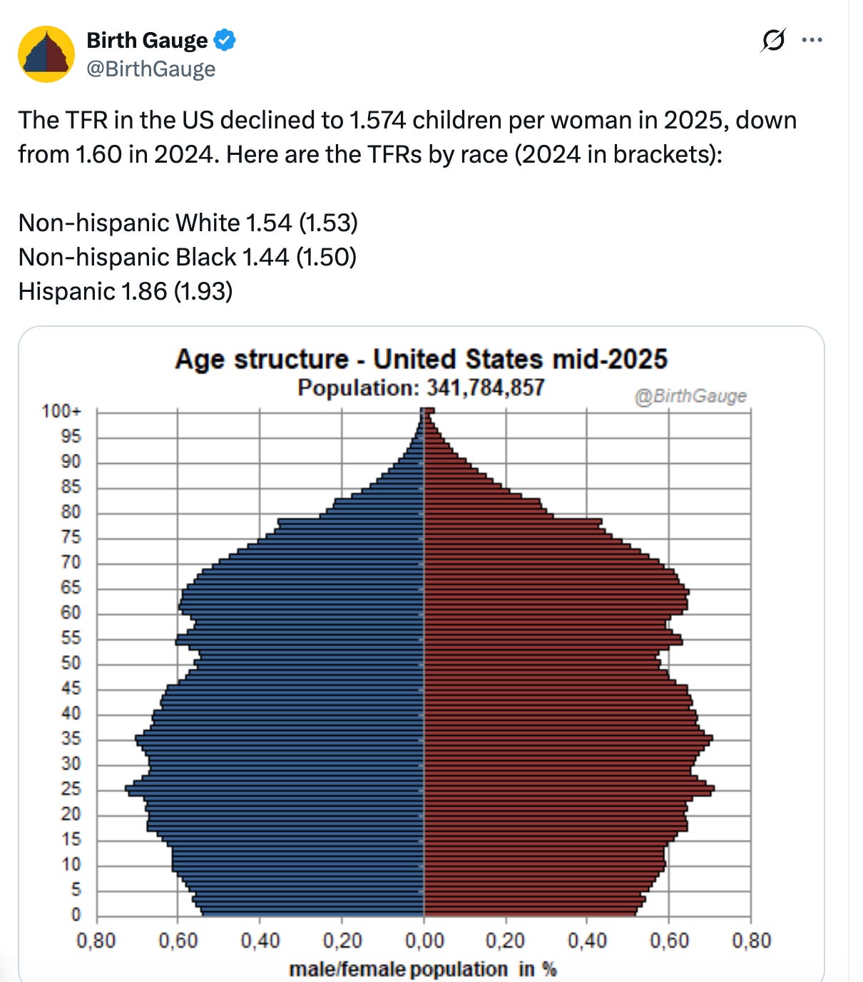 New data from 2025 has been released, and so the TFR (Total Fertility Rate) situation is back in the news. As could be expected, the sorts who focus heavily on “natalism” and TFR-connected issues are freaking out, as in many ways the data is quite bad. Or, at least, it’s worrisome if your main measurement for societal success is increasing the total amount of human biomass, with few concerns about who comprises said biomass or what its growth might mean.