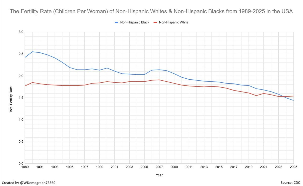 Their solutions consist of doubling down on the same disasters that led to this point: more “girlbosses”7 and more kowtowing to progressive female voters,8 namely. Methinks that will prove ineffective, and just exacerbate the “go to brunch until you die childless” problem that currently exists. Or the more outright race communists want “reparations” and so on to improve minority birthrates; given that the growth of the Great Society has tracked the decline in black birthrates, that seems ineffective too. The more cynical want to flood the country with foreigners, but right now they’re losing that battle—and the political fight is unlikely to improve for them as the children they failed to have create a political deficit.