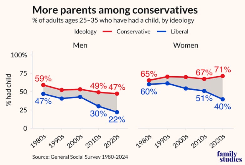 Further, as it is the most conservative people who are having kids and the most progressive people who are having no kids,6 the trend is towards children being much more likely to be much more on “the right” than moderates or liberals. In fact, there is a great deal of genetic evidence that being politically “extreme” is connected to increased fertility.7 So, there is a large, positive feedback loop for the right that seems to be playing out in real time in which the furthest right produces the most children and genetically pulls the white population ever further to the right. That loop is still in its infancy, relatively speaking, but is already present and growing in intensity.