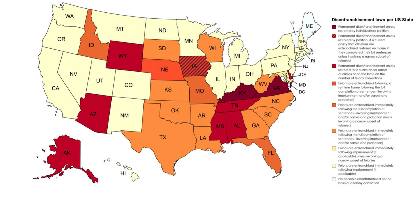 Currently, only Virginia (though this has been struck down and is ending in May of 2026), Tennessee, Iowa, and Kentucky have real felony disenfranchisement, where conviction results in a permanent loss of franchise rights unless complicated and difficult steps toward getting them back are engaged.8 A few others have more or less the same thing, generally allowing those who can pay off the various fines and fees related to imprisonment to have a path toward reenfranchisement; the cost of this remedy keeps the urban underclass from accessing it.