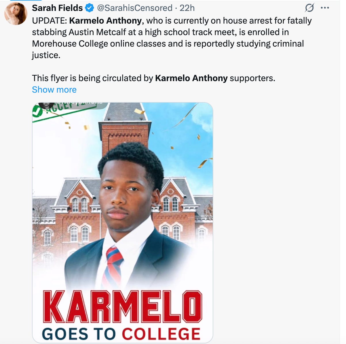 And then there’s Karmelo Anthony, who stabbed Austin Metcalf to death at a track meet. He got to graduate high school, is going to college, and isn’t even in jail despite the fact that his victim’s body is barely cold. Texas has also refused to release footage of the stabbing, presumably because it’s as incendiary as that of Irnya getting murdered by Decarlos Brown. Karmelo’s supporters, meanwhile, have insisted that he—who was (allegedly) previously suspended for bringing a knife to school3—was in the right when he stabbed an unarmed track athlete to death.
