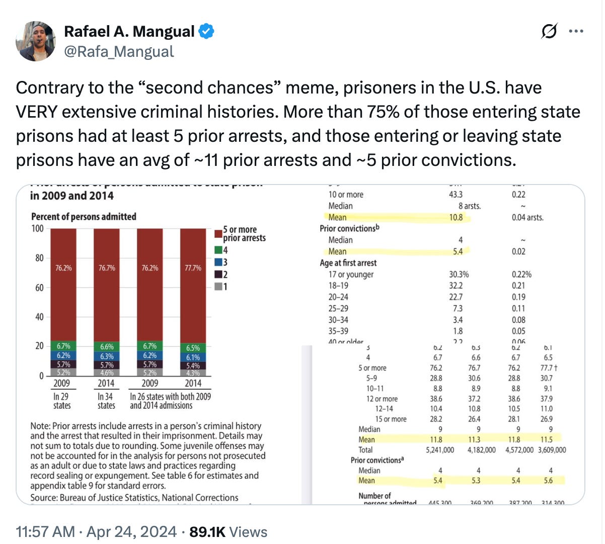 When looked at in terms of arrests rather than convictions, with the understanding in mind that pro-crime DAs involved with organizations like the Wren Collective10 generally refuse to prosecute even those arrested for major crimes, the data is even starker: a supermajority of prison inmates have almost a half-dozen arrests to their name at the point they finally face spending some time behind bars:11
